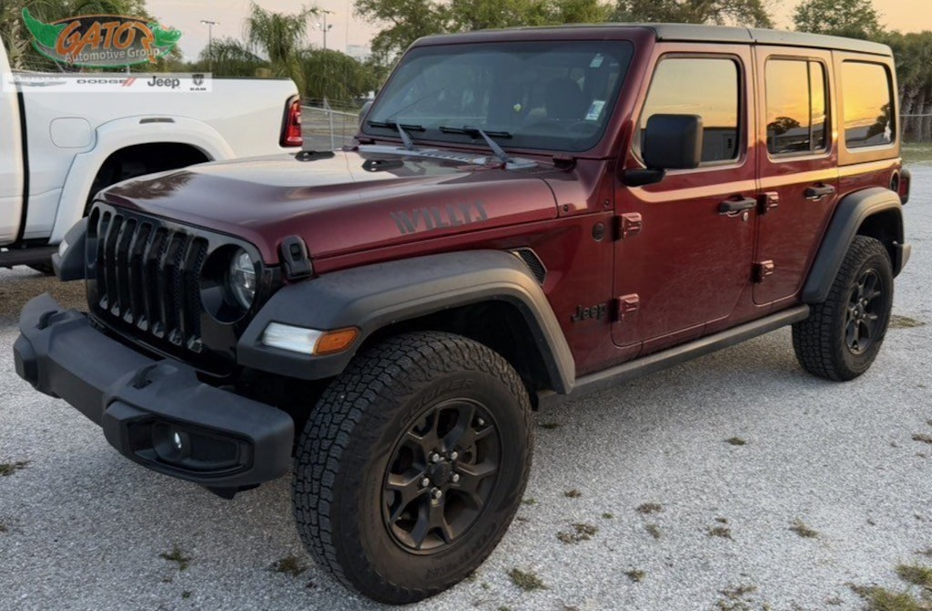 Look at this 2021 Jeep Wrangler Unlimited Willys. Its Automatic transmission and Intercooled Turbo Premium Unleaded I-4 2.0 L/122 engine will keep you going. This Jeep Wrangler has the following options: TRANSMISSION: 8-SPEED AUTOMATIC (850RE), TECHNOLOGY GROUP -inc: Google Android Auto, Cluster 7.0" TFT Color Display, SiriusXM Satellite Radio, SiriusXM Radio Service, For More Info, Call 800-643-2112, USB Host Flip, Integrated Center Stack Radio, 7.0" Touchscreen Display, Air Conditioning w/Auto Temp Control, Radio: Uconnect 4 w/7" Display, Apple CarPlay, Air Filtering, GPS Antenna Input, SNAZZBERRY PEARLCOAT, SIRIUSXM SATELLITE RADIO -inc: SiriusXM Radio Service, For More Info, Call 800-643-2112, RADIO: UCONNECT 4 W/7" DISPLAY, QUICK ORDER PACKAGE 22W WILLYS -inc: Engine: 2.0L I4 DOHC DI Turbo w/ESS, Transmission: 8-Speed Automatic (850RE), Willys, Mold In Color Bumper w/Gloss Black, Speed Sensitive Power Locks, Automatic Headlamps, Leather Wrapped Steering Wheel, Black Trail Rated Badge, 4-Wheel Drive Swing Gate Decal, Black Grille, MOPAR All-Weather Floor Mats, Willys Hood Decal, Rock Protection Sill Rails, Front 1-Touch Down Power Windows, Power Heated Mirrors, Wrangler Decal, Matte Black Jeep Badge, Security Alarm, Remote Keyless Entry, Sun Visors w/Illuminated Vanity Mirrors, Front LED Fog Lamps, LED Premium Reflector Headlamps, MOPAR ALL-WEATHER FLOOR MATS, GVWR: 5,400 LBS (STD), ENGINE: 2.0L I4 DOHC DI TURBO W/ESS, and BLACK, CLOTH LOW-BACK BUCKET SEATS.